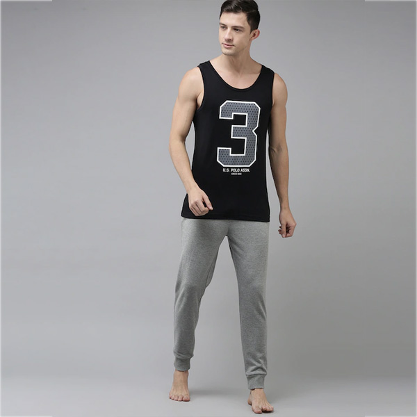 • Black & Grey printed gym innerwear vest, has a round neck, sleeveless