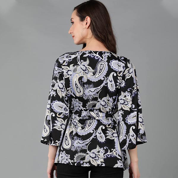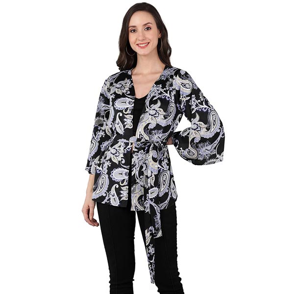 • This Short jacket is made from printed crepe and is with waist tie-up belt & 3/4th bell Sleeves, can be worn as a short shrug or jacket. It can add zing to any outfit. Team it up with a belt or any other ACcessory to make heads-turn. Furthermore, it is recommended to be kept away from extreme heat, fire and corrosive liquids to avoid any form of damage.