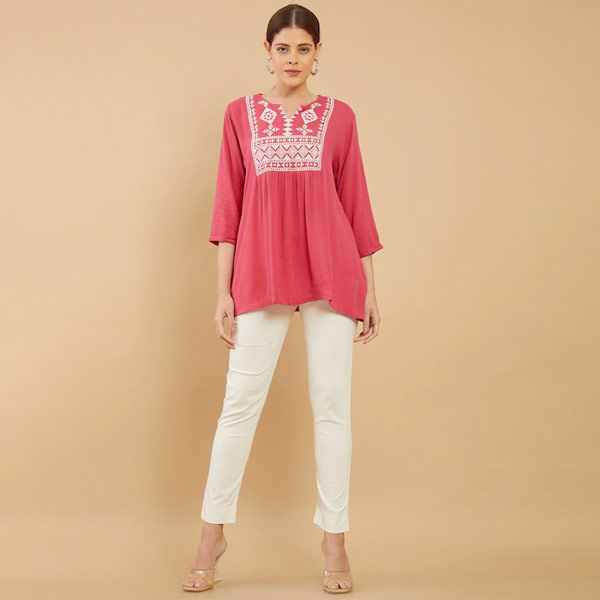 • "Pink and white embroidered tunic ,has a v-neck, three-quarter sleeves